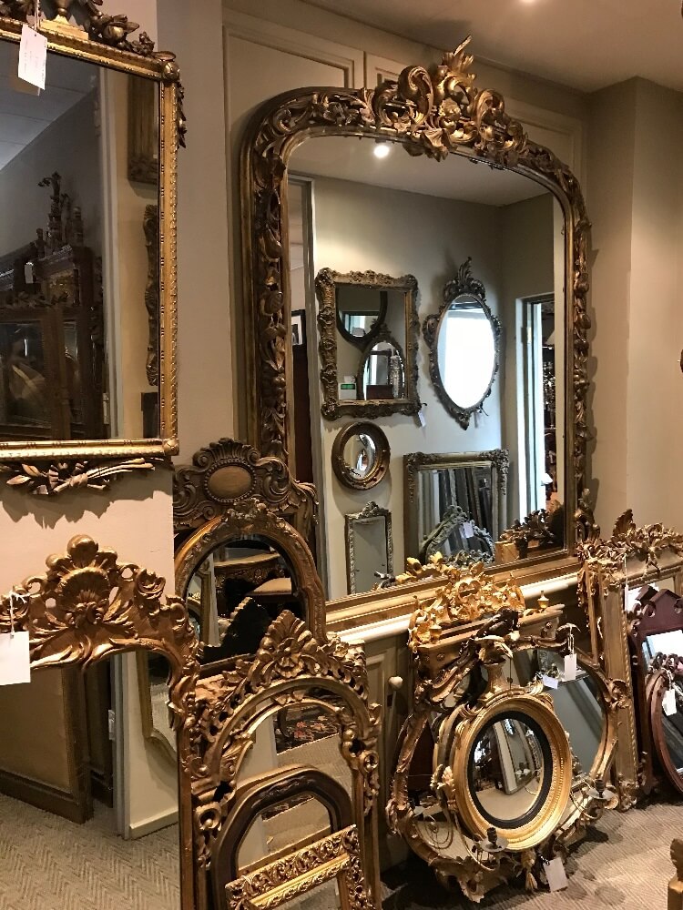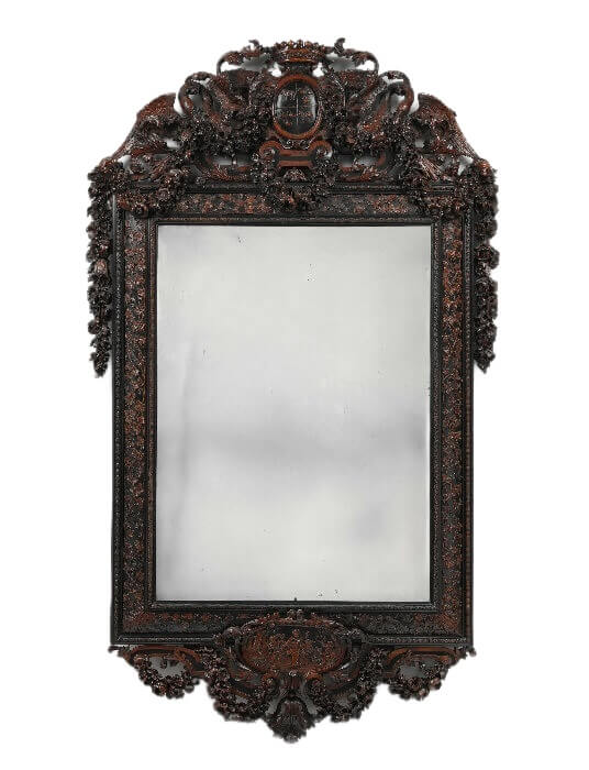 Зеркала этого времени часто украшены золотым или серебряным патинированным лепниной, инкрустациями из драгоценных камней и изящными резными рамами.